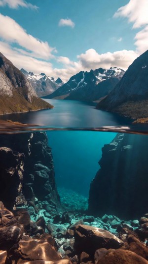 Symmetrical view of a mountain fjord above and below the surface