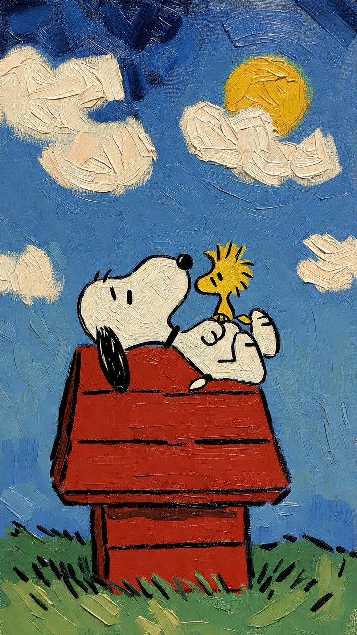 Textured oil painting of Snoopy and Woodstock on the red doghouse