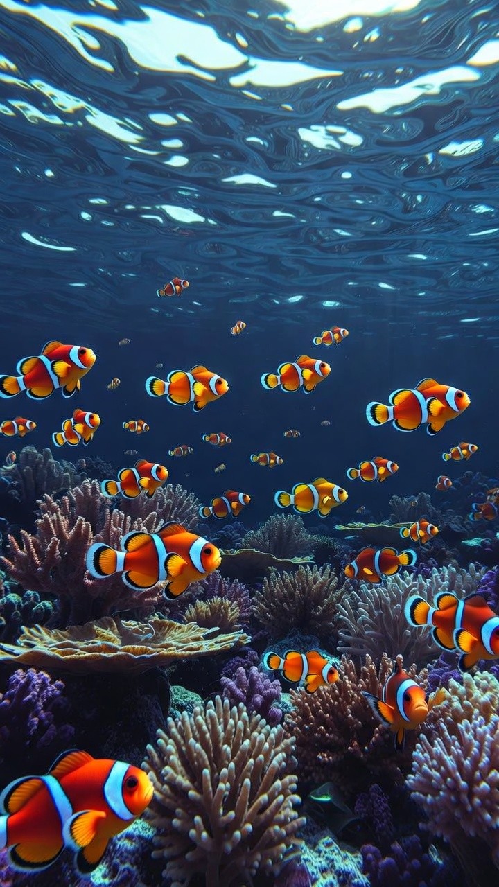 Immerse yourself in a dynamic underwater ballet! This stunning live wallpaper plunges you into a thriving coral reef, teeming with a massive school of bright orange clownfish. The unique upward perspective highlights the mesmerizing, sunlit ripples of the ocean surface above, creating a truly immersive and deeply relaxing aquatic atmosphere. It is the perfect, lively pocket aquarium to bring a splash of tropical beauty to your daily routine.