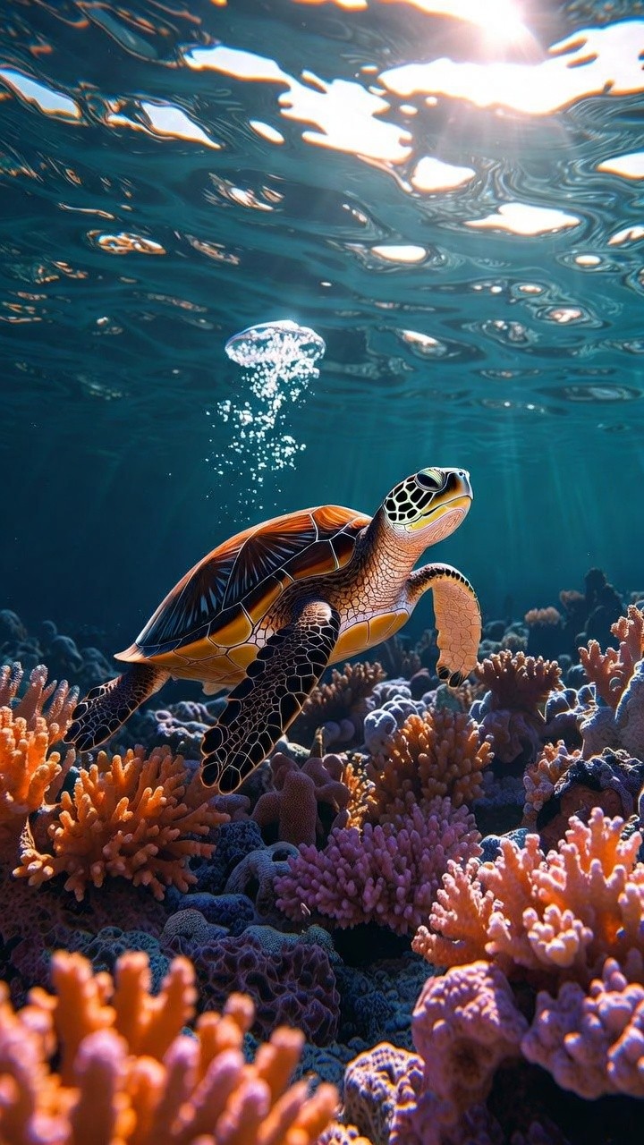 Immerse yourself in the breathtaking beauty of the ocean with this vibrant live wallpaper. A majestic sea turtle gracefully ascends toward the sunlit surface, navigating through a stunning, colorful coral reef. With crystal-clear blue waters, radiant sunbeams, and delicate rising bubbles, this dynamic aquatic scene brings a deeply peaceful and mesmerizing slice of nature right to your lock screen.
