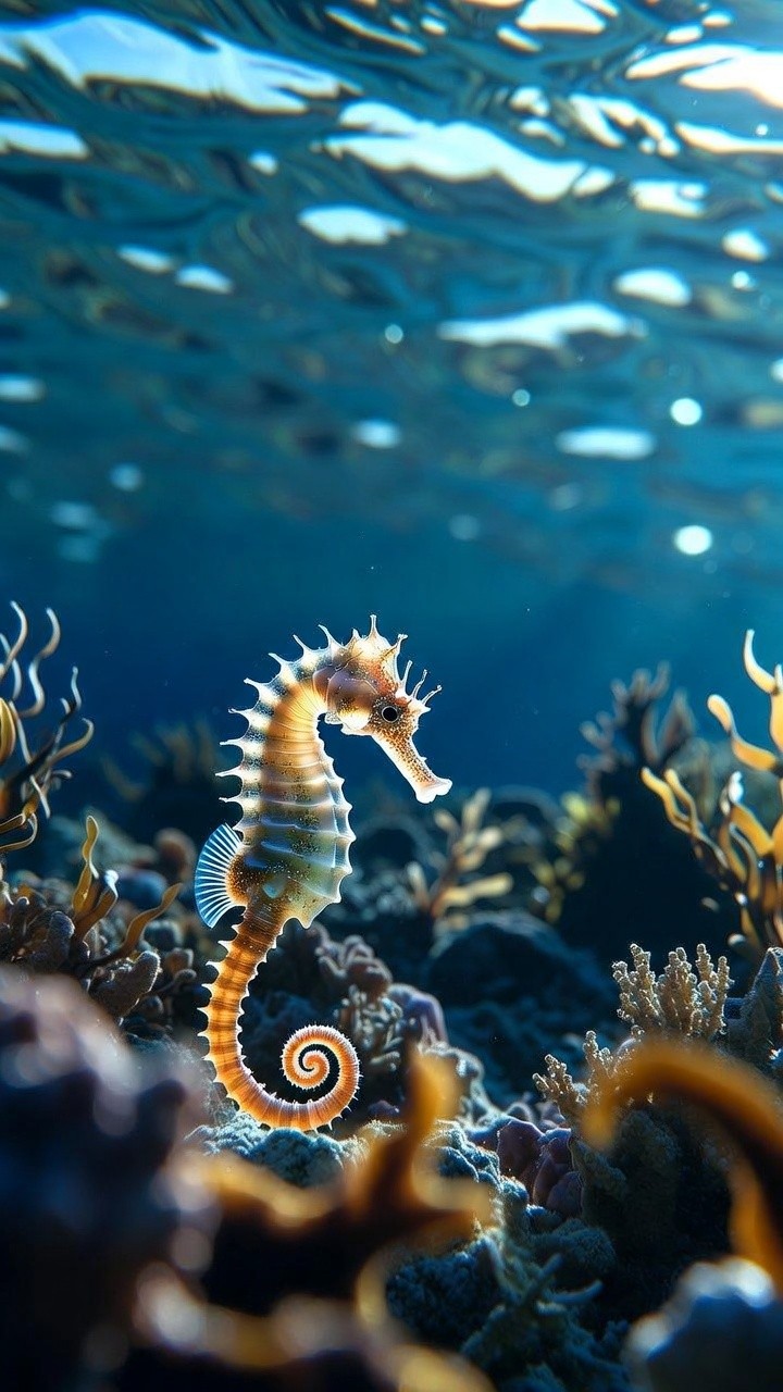 Bring a touch of delicate marine magic to your screen! This mesmerizing live wallpaper features a beautifully detailed seahorse floating gracefully among golden underwater foliage. Crystal-clear blue waters are illuminated by radiant sunlight filtering through the gently rippling surface above, casting a serene and peaceful glow. This calming aquatic scene is the perfect, elegant addition to your pocket-sized virtual aquarium.