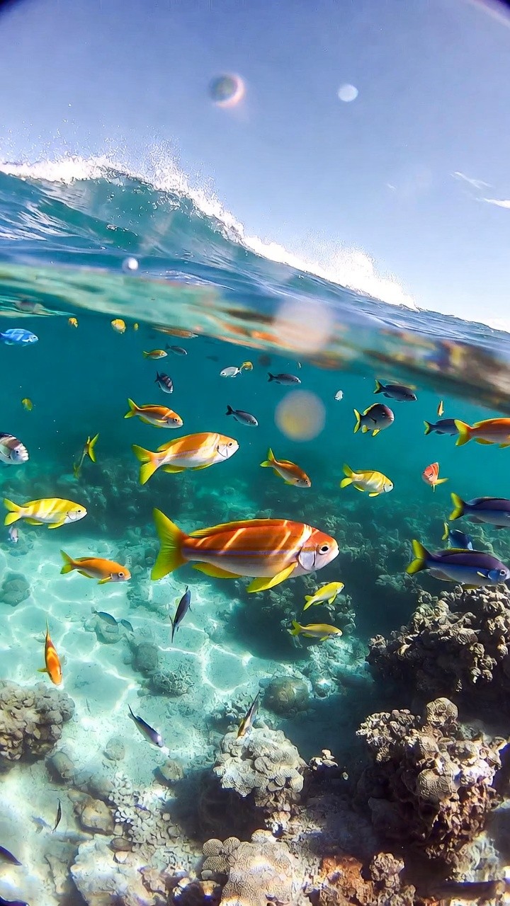 Immerse yourself in a lively tropical paradise! This vibrant live wallpaper features a bustling shallow reef teeming with a kaleidoscope of colorful tropical fish. With crystal-clear turquoise waters, a bright, sunlit sandy sea floor, and dynamic water ripples catching the light from above, this cheerful aquatic scene brings an instant splash of summer energy directly to your screen.
